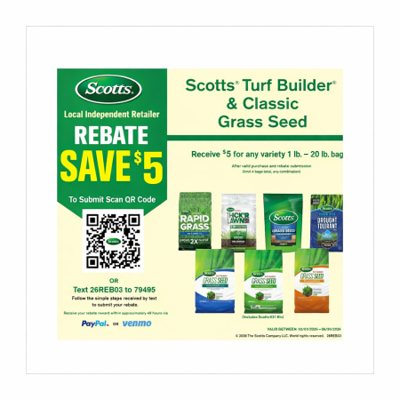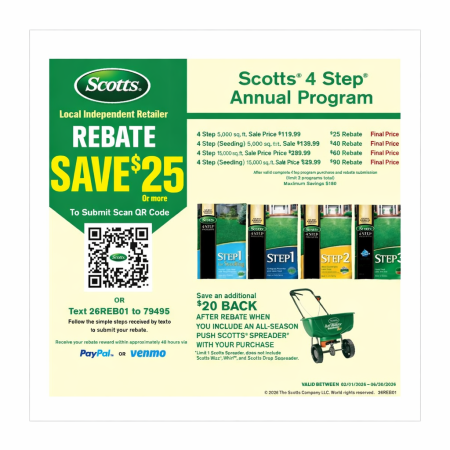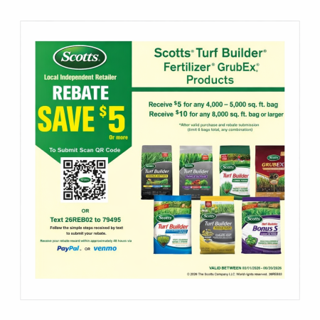 Save an additional $20 back after rebate when you include an all-season push Scotts Spreader with your purchase.* * Limit 1 Scotts Spreader, does not include Scotts Wizz, Whirl, or Scotts Drop Spreader. After valid purchase and rebate submission (limit 2 program total) Offer expires 8/15/2026 Click for digital rebate & offer details. (26REB01) |