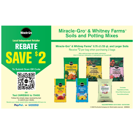 Some products are NOT available at Spotts Garden Center. After valid purchase and rebate submission (limit 6 bags total, any combination) Offer expires 8/15/2026 Click for digital rebate & offer details. (26REB02)or TEXT 26REB02 to 79495 |